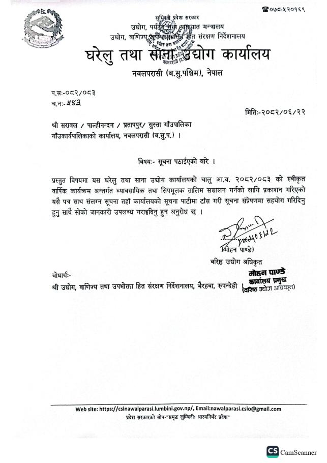 घरेलु तथा साना उद्योग कार्यालय नवलपरासी(ब.सु.प.) को सूचना