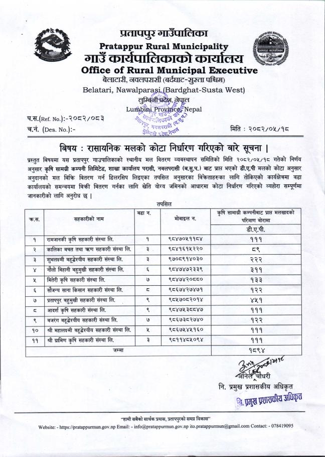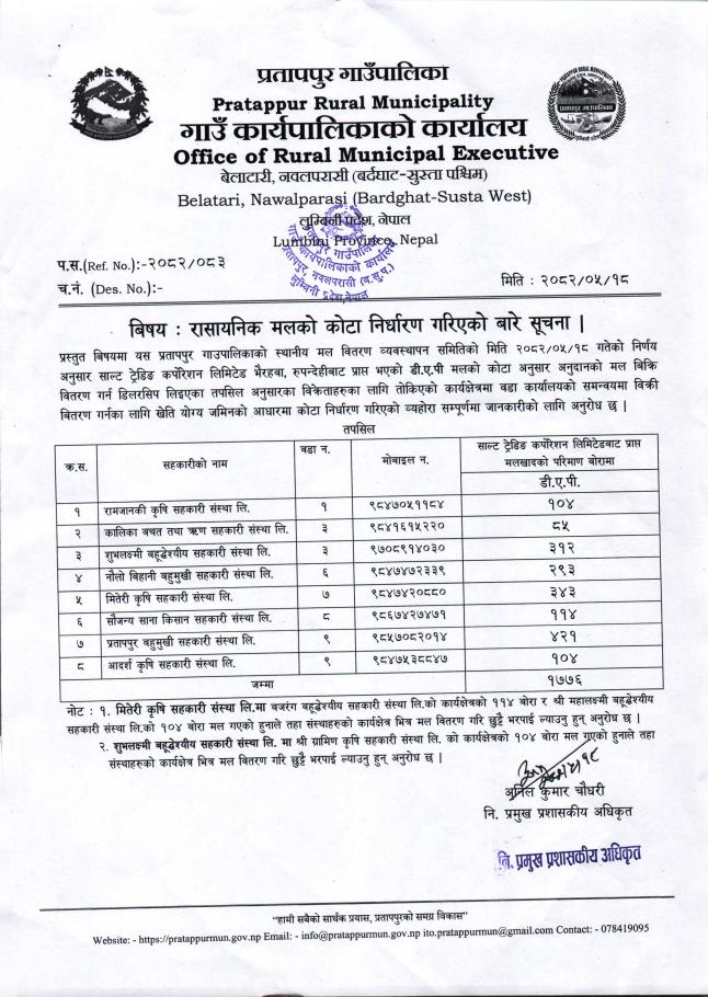 रासायनिक मलको कोटा निर्धारण बारे सूचना