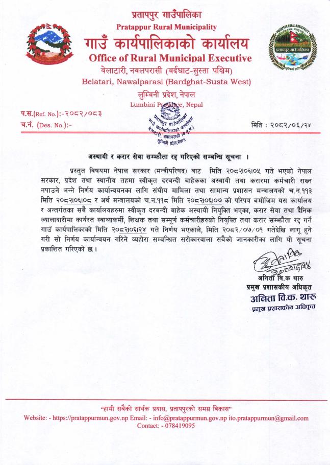 अस्थायी र करार सेवा सम्झौता रद्द गरिएको सम्बन्धी सूचना ।