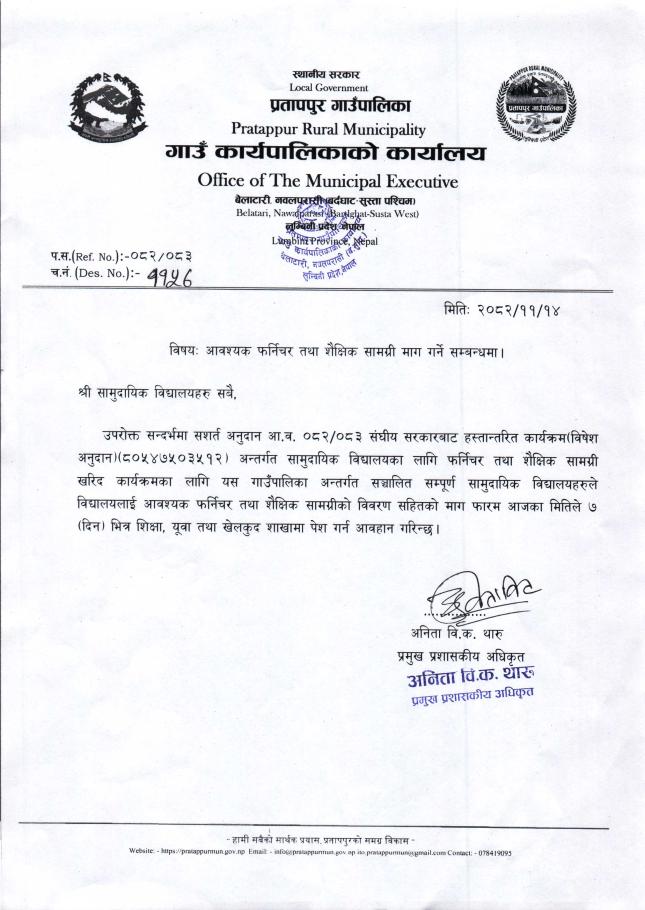 » आवश्यक फर्निचर तथा शैक्षिक सामग्री माग गर्ने सम्बन्धमा ।