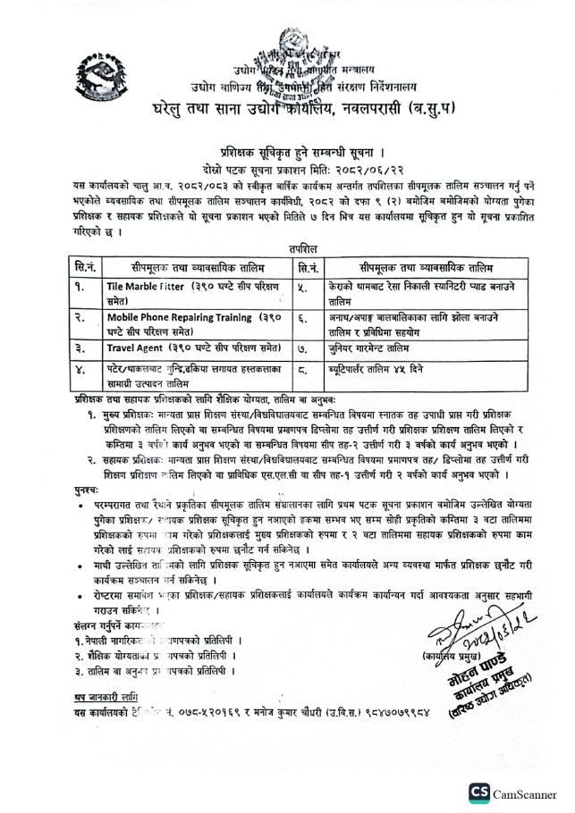 घरेलु तथा साना उद्योग कार्यालय नवलपरासी(ब.सु.प.) को सूचना
