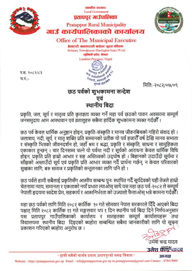 छठ पर्वको शुभकामना सन्देश एवं स्थानीय बिदा