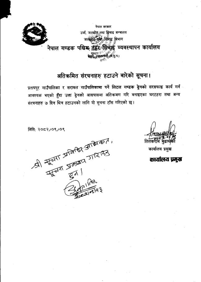 नेपाल गण्डक पश्चिम नेहर सिंचाई व्यवस्थापन कार्यालयको अतिक्रमित संरचनाहरु हटाउने बारेको सूचना !