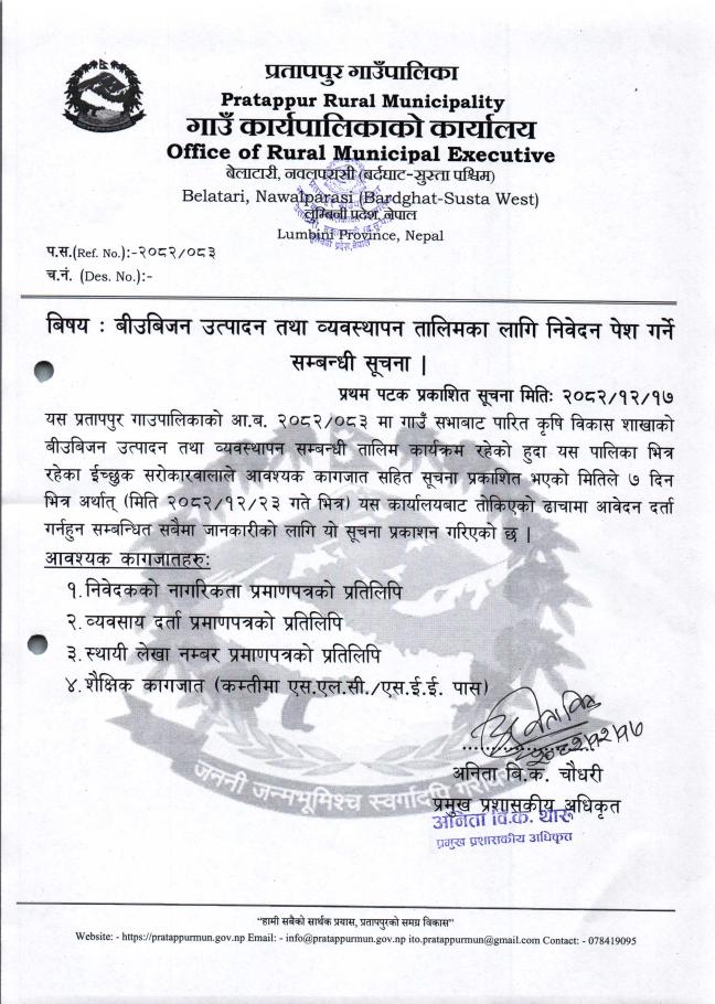 » बीउबिजन उत्पादन तथा व्यवस्थापन तालिमका लागि निवेदन पेश गर्ने सम्बन्धी सूचना ।