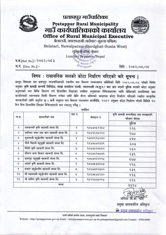 रासायनिक मलको कोटा निर्धारण गरिएको बारे सूचना ।